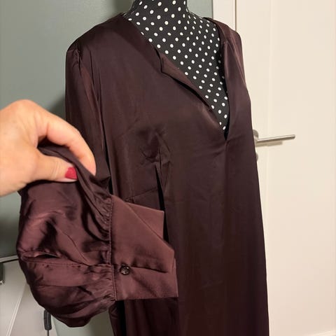 Burgunder innsvinget bluse i «silkelook» fra Mexx.