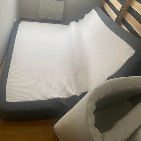 Sengen er ca fem år. Hovedmadrass ble byttet ut i nov 2024, der det ble kjøpt en helt ny hovedmadrass( fast) verdi 14999,- bare madrass. Vi har brukt en Dormeo tempurovermadrass med kjøle og varme på hver sin side over hele veien. Denne kan følge med om ønskelig. Hovedmadrassen har aldri blitt ligget direkte på.