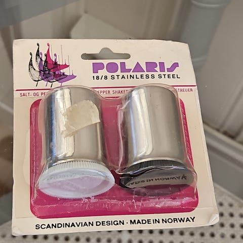 Små salt- & pepperbøsser fra Polaris. Måler hhv rundt H40mm/Ø40mm og H45mm/Ø35. Fremstilt i rustfritt stål og plast. For det meste i pent brukt stand, se bilder. Selges for 100,-/sett. k45