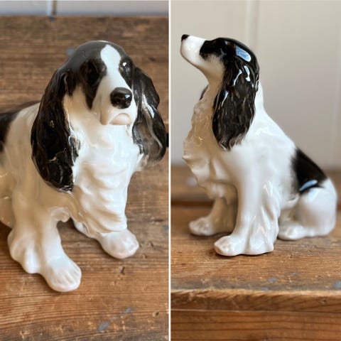Nydelig gammel porselenshund fra Holland. Hel og fin. God størrelse . 24 cm høy på høyden sittende.. pris kan diskuteres. 550kr eller begge for 900kr fra Holland. Merket under