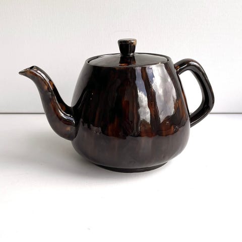 Gammel, engelsk, gul tekanne selges. Kitsch stil. Nag på tut og krakelert. Nostalgisk og romantisk og super fin som pynt. Noe bruksmerker kan forekomme. Selges som den er. Se bilder.