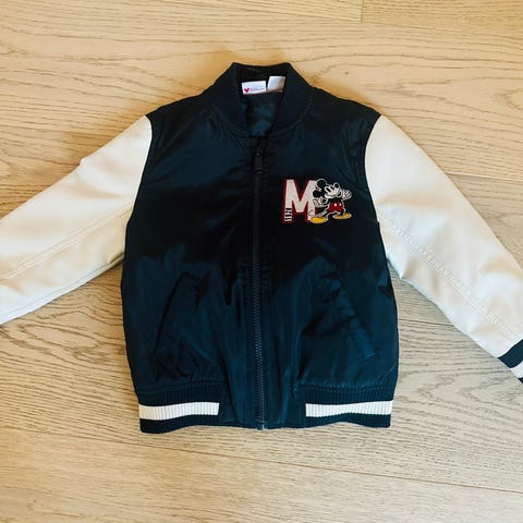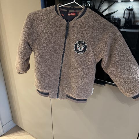Bomberjakke som passer perfekt både vår og høst. Kan brukes begge veier, enten med svart print eller epleprint. Str 104. Fremstår som ny