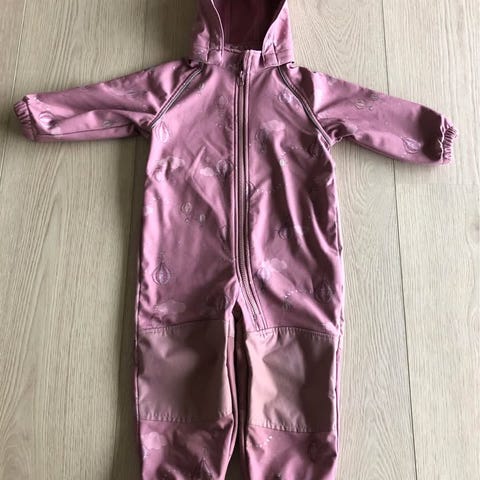 Mørkeblå softshelldress med hvite prikker i str. 86 fra NameIt. Dressen er pent brukt av ett barn én vår- og høstsesong i barnehage. Den mangler fotstrikker nederst, men er ellers i god stand.