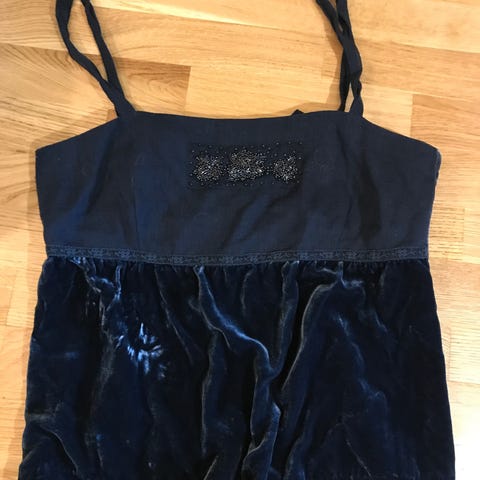 Fin topp; sort bunn med fjærmønster. 58% silke/ 42% bomull. Pent og lite brukt! Romslig modell.