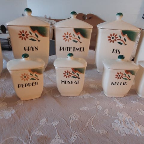 Flotte krydder/ mel/ sukkerkrukker i porselen fra ca 1950 tallet selges kr 250 samlet. Står ikke navn på produsent.