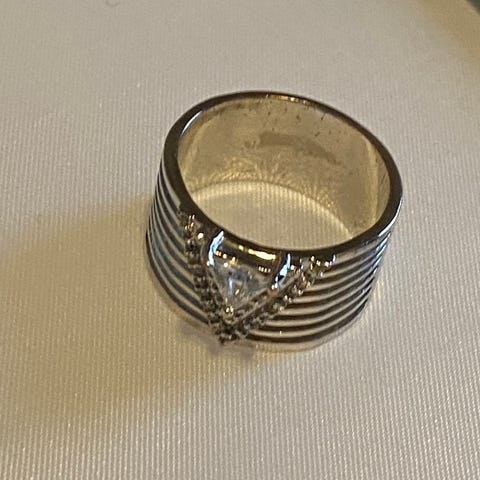 En usedvanlig flott rhodinert sølvring 925 med grønn pæreformet peridot + ca 50 hvite topazer. Diameter; 17 mm.