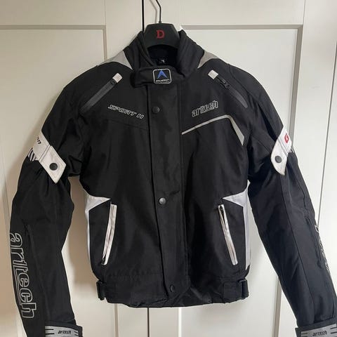 Hel jakke uten skader. Fin passform med strikk i siden og borrelåser bak for justering. Glidelåser og borrelås på ermene. Godkjente polstringer i skuldre og albuer med lomme i rygg for avtakbar ryggbeskyttelse.