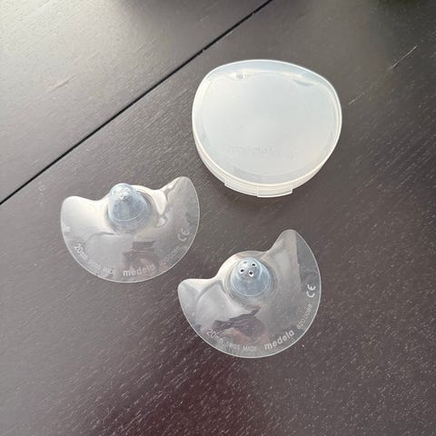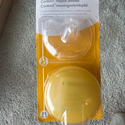 Ammeskjold i myk silikon. Legges over den såre brystvorten, beskytter men lar babyen amme. Den ene er ubrukt. Sterilisert og kommer i et smart etui. Kr 50,-.