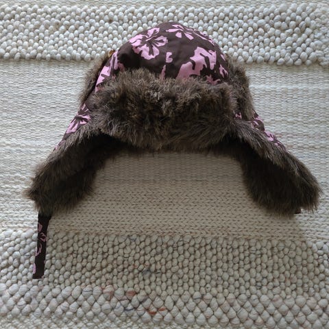 Tøff lue med øreklaffer og munn /nese bind, med trykknapper. Svart med hvitt mønster. Acryl og polyester. One size. Foret med fleece teddy og flanell. Ubrukt men uten lapp.