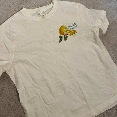 Hvit T-skjorte fra H&M med stilig print med palme, leopard og måne 😅 Denne er brukt en gang eller to og er fin som ny uten bruksmerker ☺️ Størrelse L, lengde 60 cm, bredde 60 cm, materiale: bomull.