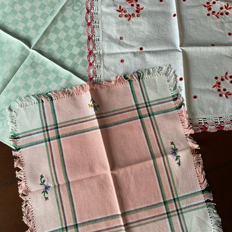 Pene, eldre duker til hverdag og fest. Se bildetekst for mål. 250,- pr. stk. Sender gjerne :-)