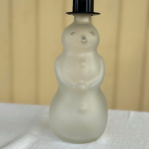 Snømann med fugl nek i hånden og floss hatt på hode.