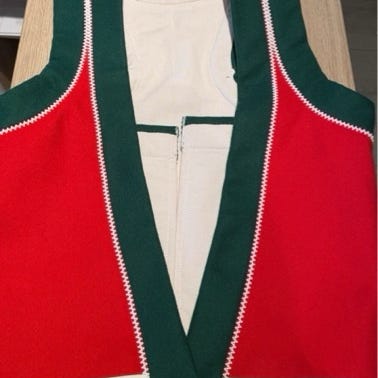 Fin ullvest, rillestrikket, tomatrød med detaljer i vinrød og dyp rødlilla/plomme. Dessverre for liten til meg. Målt på tvers under ermehull 43 cm, lengde midt bak 56 cm.