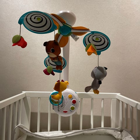 Nydelig uro med musikk og søte figurer, 3 forskjellige melodier som spiller opp til 20 min. Med et dempet nattlys og muligheter for å justere lydnivået.
