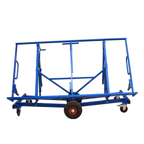 Platevogn for gips, sponplater, glass etc. Med et enkelt håndgrep kan vognen forvandles fra transportvogn til arheidsbord. Hjulkonstruksjonen gjør att ransport på ujevne underlag blir stabilt. Godt egnet for platebredde 900 og 1200 mm.