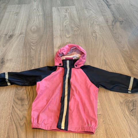 Fin regnjakke fra Name it. Godt synlig ute. Mangler en knapp på innsiden øverst. Ellers ingen merknader jeg kan se.