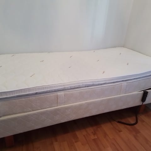 Sengen består av 2 ramme madrasser, overmadrass og madrass. Overmadrassen har bruksmerker. Følger også med bein. Sengen er 180×200. Den ene kontrollen funger ikke, men dette kan kanskje fikses. Justerbar seng - Sultan Alsvåg fra IKEA.