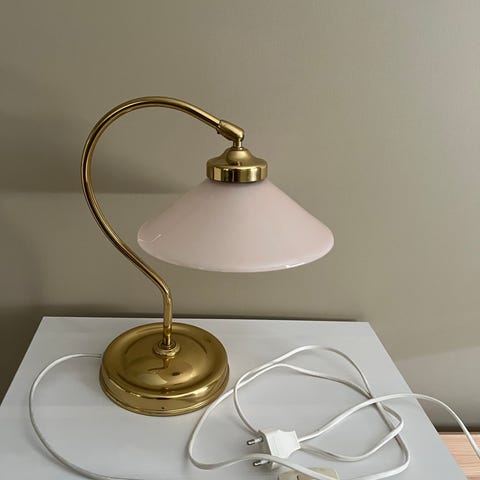Elegant bordlampe selges. Lyserosa skjerm i glass m/gullfarget fot. Fungerer. Trenger litt vask. Noe bruksmerker/slitasje her og der. Selges som den er. Se bilder.