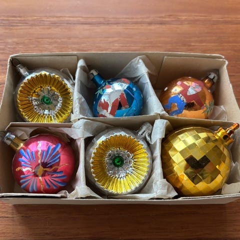 Antas å være mellom 60-70 år gammel og er håndlagede munnblåste glasskuler. Made in GDR (Gamle Vest Tyskland). Antikvarer mener prisen er bortimot 1000,- pr eske, så her kan du gjøre ett kupp.