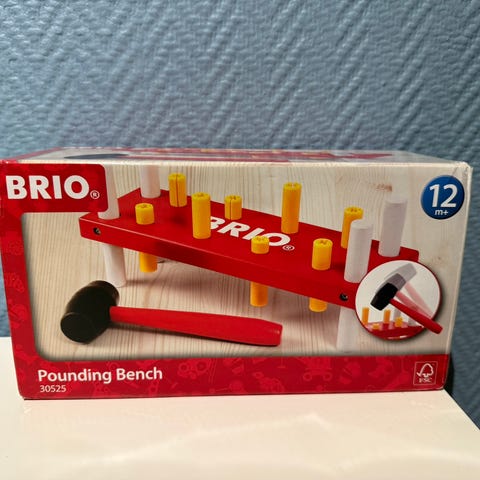 De 8 fargede stiftene må slås ned igjennom hullene med hammeren. Bankebenken fremmer motoriske ferdigeter.