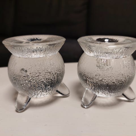 Selger to lysestaker i glass for 35 kroner. Høyde 18 og 25 cm. Selges med store "telys".