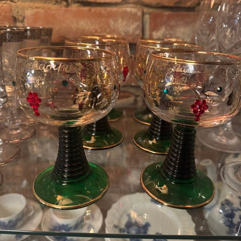 Laget i Tyskland, glassen har en unik bikubegrønn stilk, det ene har gullkant og har glitrende rhinestones. Perfekt for servering av vin eller andre drikker, den glasset vil garantert imponere gjestene dine med sin elegante og karakteristiske design.