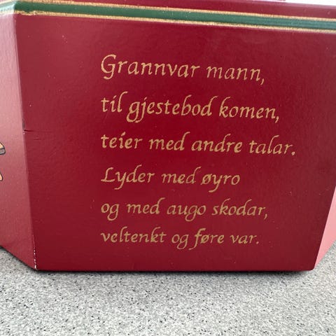 Solid åttekantet dekorert julebolle. Hver side er ulik. Bredde: 27 cm, dybde: 27 cm, høyde: 10 cm. Har stått ubrukt i skap noen år.