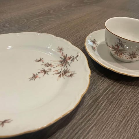 Som vist på bildet har tallerknene små riper i seg som er synlig i riktig lys. Selges derfor billig, samlet pris 100kr.