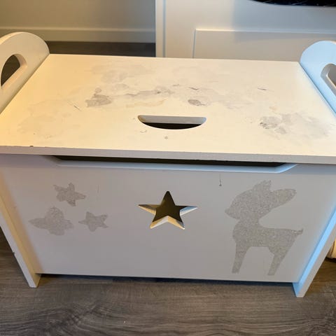 Ny benk med oppbevaring fra H&M home, fortsatt i pakken. Mørk grå.