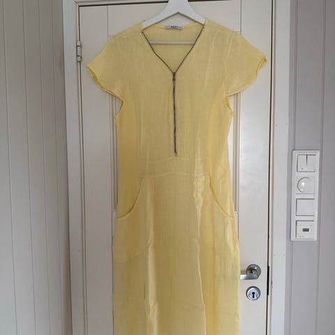 Luftig gul kjole, stikk i livet og knytebelte.
