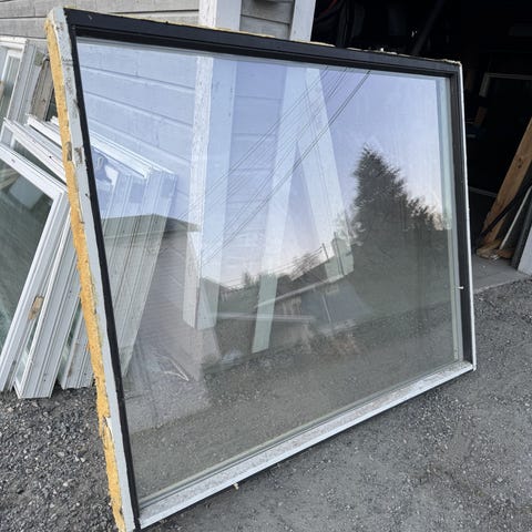 Ubrukt alubelagt trevindu selges 2 lags isolerglass med energibelegg som står i vinduet.