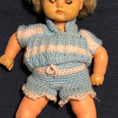 Selger en eldre dukke. 70 tallet? Mangler litt hår på øyelokket. Ellers bra stand. 50 cm .