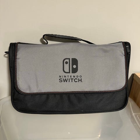 Plass til spill, ekstrautstyr (f.eks ørepropper) og en nintendo switch med dock og kontrollere.