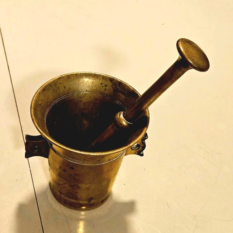 En veldig fin morter som er vintage. Den hae alltid vært i hjemme siden jeg var liten, så den er 27 år+ gammel. Veldig god kvalitet. Kan brukes til å knuse krydder som for eks. koriander, kardemomme og lignende krydder som skal bli knust til grov tilstand.