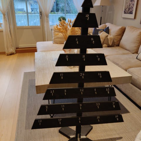 Stor Fin adventskalender i stoff med 24 ringer til å henge gaver i.