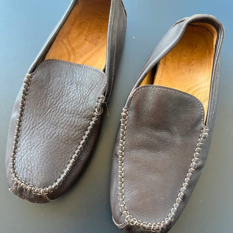 Skoene er I forskjellige størrelser og stand.