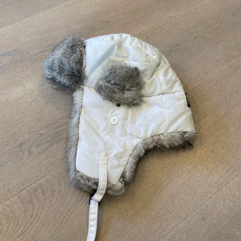 Hvit strikket lue fòret med brunlig kunstpels, varm og god. Stropp med borrelås som kan festes under haken eller på toppen. Aldri brukt, kun prøvd på.