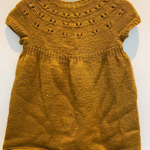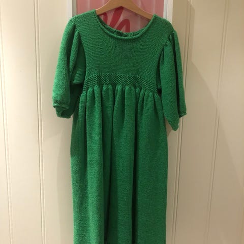 Håndstrikket kjole i 50% bomull og 50% merino, helt kløfritt garn.