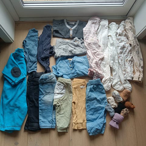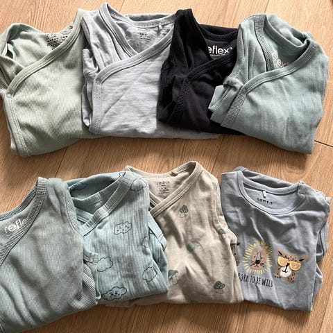 Pent brukt ullpakke, str 62-68. 4 bodyer, 1 ulljakke, 1 ullbukse, 2 strømpebukser og 1 par tjukke sokker. Pent brukt.