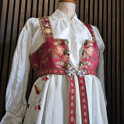 ● nybrodert forkle hører til(Mo), eller blømstrete forkle broderingspakke kjøpt på Husfliden