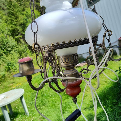 Lampekuppel. Lampeskjerm. Antikk. Innvendig diameter 33 cm. Innvendig dybde 22 cm. Ce en cm til med tykkelsen av porselenet. Henges opp i tre medfølgende søte kjettinger i en krok i taket. Lyspære henges ned inn i kuppelen / skjermen med en ledning. Hentes på Tåsen i Oslo.