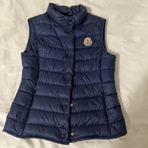 Pent brukt Moncler dun jakke. Med ekte pels. Halvlang med mulighet for å stramme strikk i livet.
