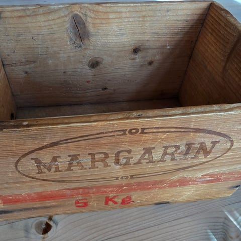 - Margarin eske i papp-18 kg. Namsos margarinfabrikk A/L. Mål 38 cm x 25x24. Det lå en avisdel datert 1937. Det er en adresselapp sendt fra Andreas Hovig til en mottaker i Overhalla (Claussen?? vanskelig å tyde). Pris kr 100