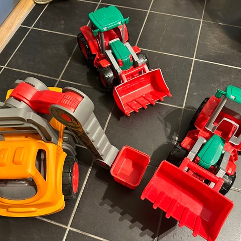 John Deere leketresker, ny pris var 900 kr. En del er brekt av, se bilde. Ellers i orden. Selges for 250 kr. Må hentes.