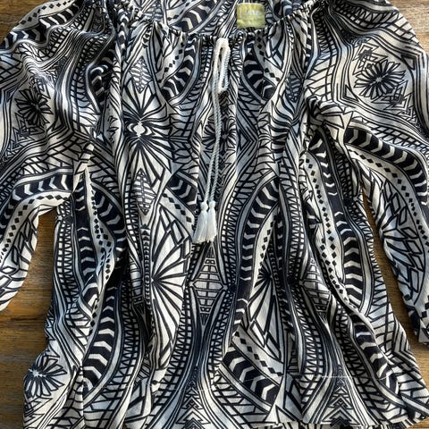 "Line of Oslo" lårlang tunika. Selges fordi den er litt for stor. Str S, men den er stor i størrelsen og er nok nærmere en M-størrelse. Lårlang, rett fasong. Sort materiale med fin bord med perler på mansjettene. Påsydde perler også i halslinningen. Noen perler har løsnet, se bilder. Pent brukt. Oppbevart i et dyre- og røykfritt hjem.