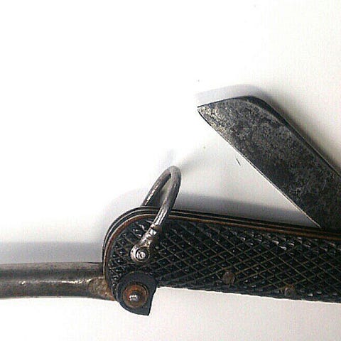 Dette er en brukskniv med høy alder, og den bærer preg av dette. Kniven har betydelige bruksmerker, riper, slitasje og patina på metallkomponentene. Bladene åpnes og lukkes, men den kan trenge rengjøring og vedlikehold. Se bildene nøye for å vurdere tilstanden.