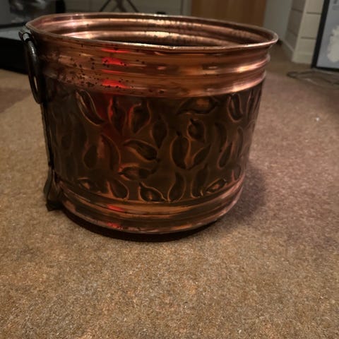 Vedkurv i messing ønskes kjøpt, se bilder til illustrasjon eller liknende.