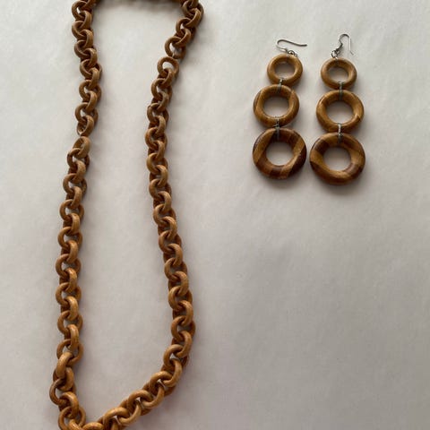 Smykkesett i tre og detalj i keramikk. Kr 400