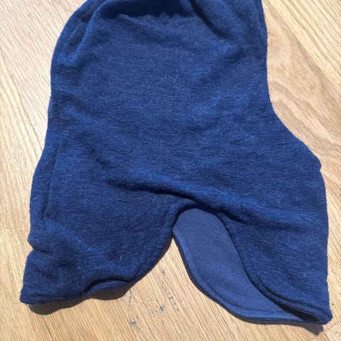 Ull-baloklava selges. Litt usikker på str, men tror det er ca 60-70. Husker min datter brukte denne da hun var ca 4-6 mnd. Super under andre lag, eller når babyen skal sove. Den fungerer ypperlig sommer som vinter, da babyer må ha beskyttelse for å ikke få ørebetennelse som de lett får (også sommer). Er nesten 100% sikker på at dette er 100% merinoull, men teksten på vaskelappen er utydelig.