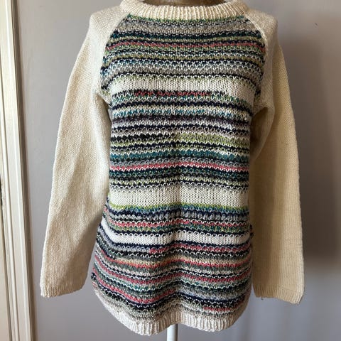 Strikkegenser fra H&M med mintfarget finstrikket bakside og fargerik front.
